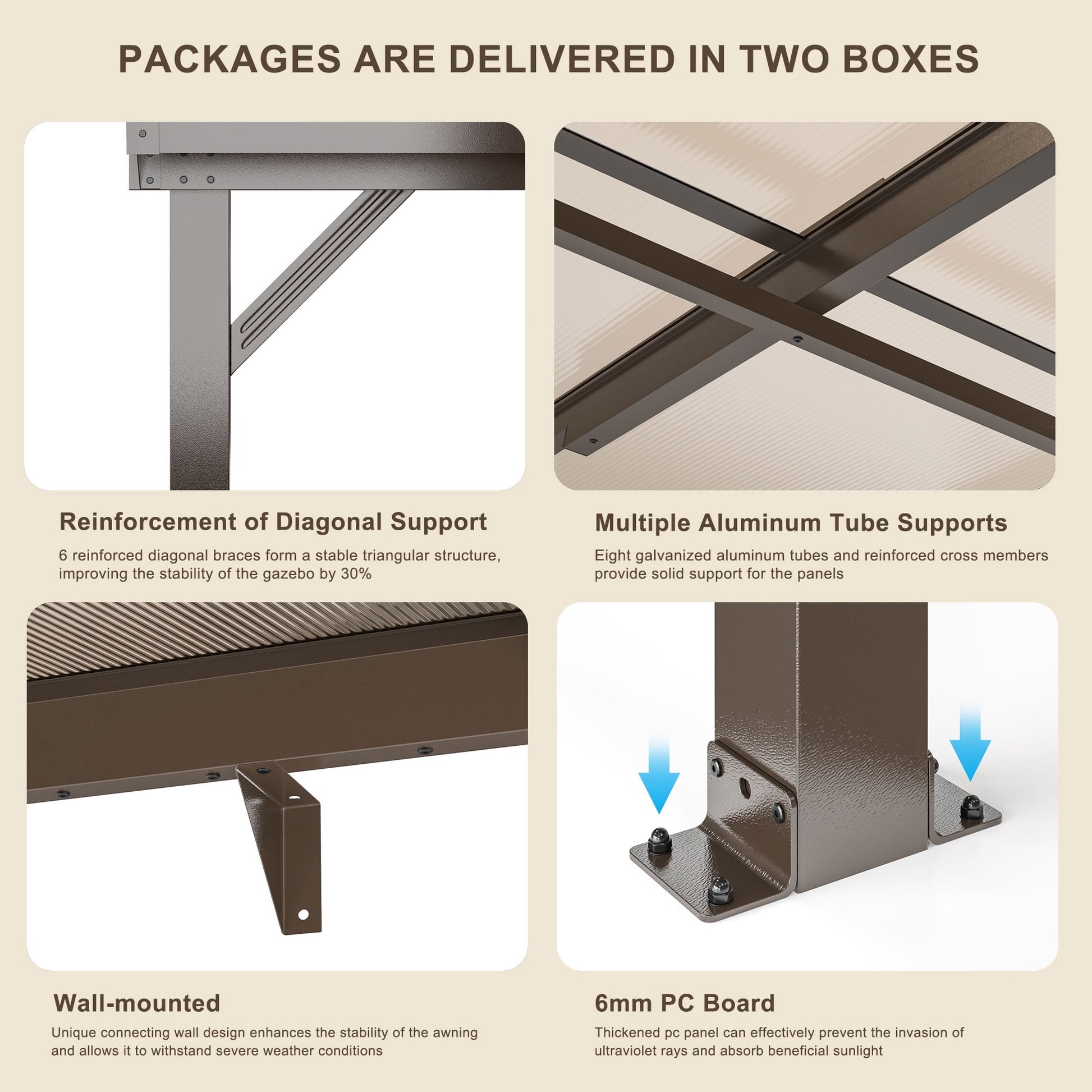 - Selected Materials: AirWire wall-mounted pergola adopts 6mm thickened PC hollow panel, which insulates 99% of UV rays while ensuring sufficient light. Outdoor gazebo roof panels are supported by crossed aluminum tubes. The triangular structure of the roof and the four-hole galvanized aluminum tubes provide an excellent weighing capacity of 66 lbs/©O.